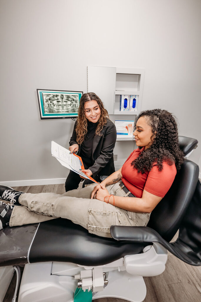 Cosmetic dentist in Herndon talking to a new patient at his dental office before her treatment.